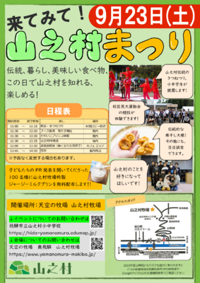 今回は、子どもたちの「山之村の魅力を知ってもらいたい。山之村のことを好きになってもらいたい。」という願いのもと、9/23(土・祝)に「山之村まつり」を開催します。