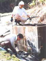 今思うと夢のようですが、平成九年九月までは、上水道は学校を含めて地域全体が山水を使っていました。現在ゼンマイ採りをしている山から流れる山水を写真のタンクに貯め、道路を挟んで運動場東側に今も残っているポンプを使って学校へ上げていました。毎日このタンクの点検をするのが本校教頭の日課でした。時として熊に出くわし、命からがら逃げてきたという事もあったそうです。落葉の季節や大雨の次の日など、このタンクによく木の葉や土がたまり、学校の蛇口から水が出なくなりました。そうなると、トイレも給食も困るので、授業中であろうが、写真のように職員がタンクの掃除に行って対処していました。夏休み前、冬休み前には定例で必ずこの作業を行っていたそうです。